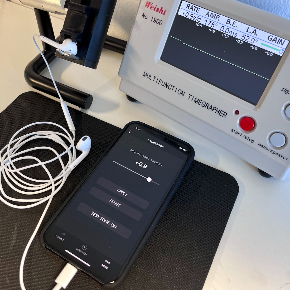The app will play a perfect 28800 V/H beat, posing as a watch, so that the timegrapher can "measure" its error rate. Observe the results for couple of minutes. Once a stable value is shown on the timegrapher, adjust the Error Correction slider to match it. For example, if the measured error was +0.9 S/D, then the correction should be set to the same +0.9 S/D.
